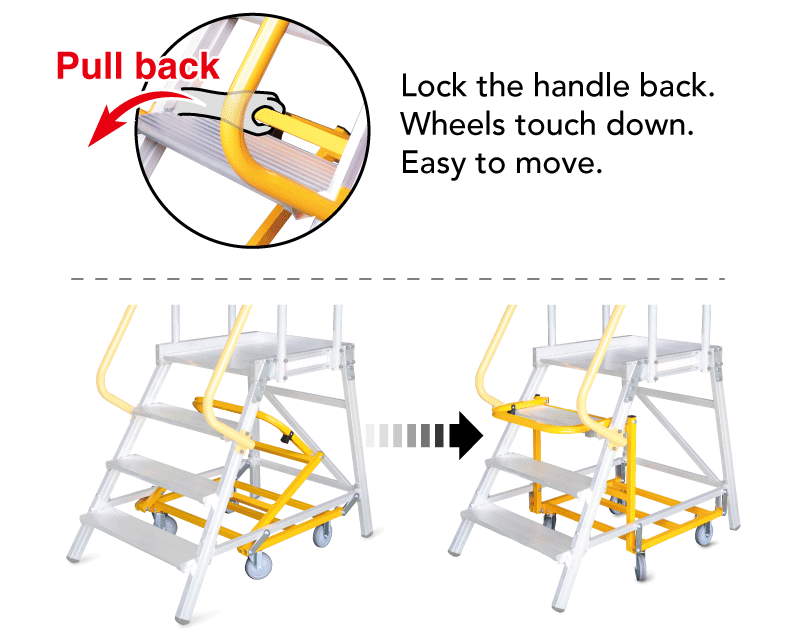 Quickly lifts wheels off the ground — no need to step on brakes one by one like traditional ladders.