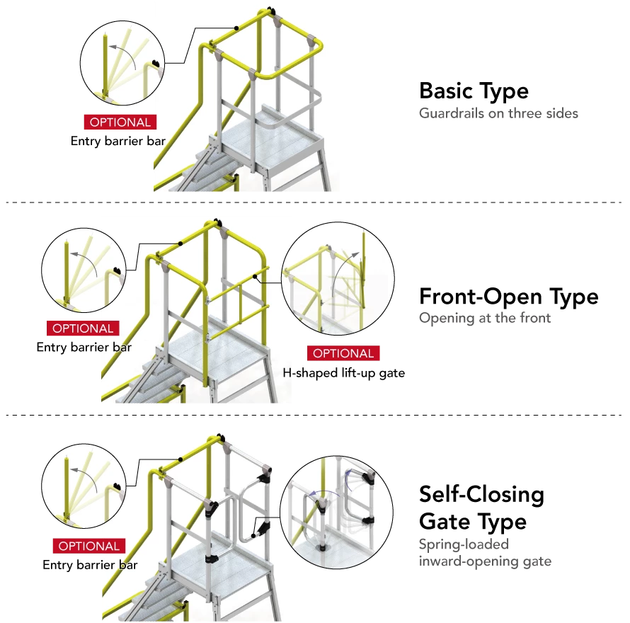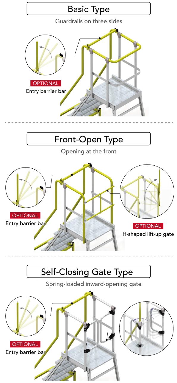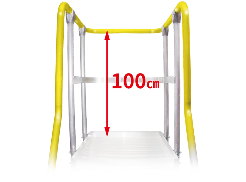 an extra-wide working area, 180 mm deep steps, 100 cm-high guardrails on three sides, and integrated handrails.